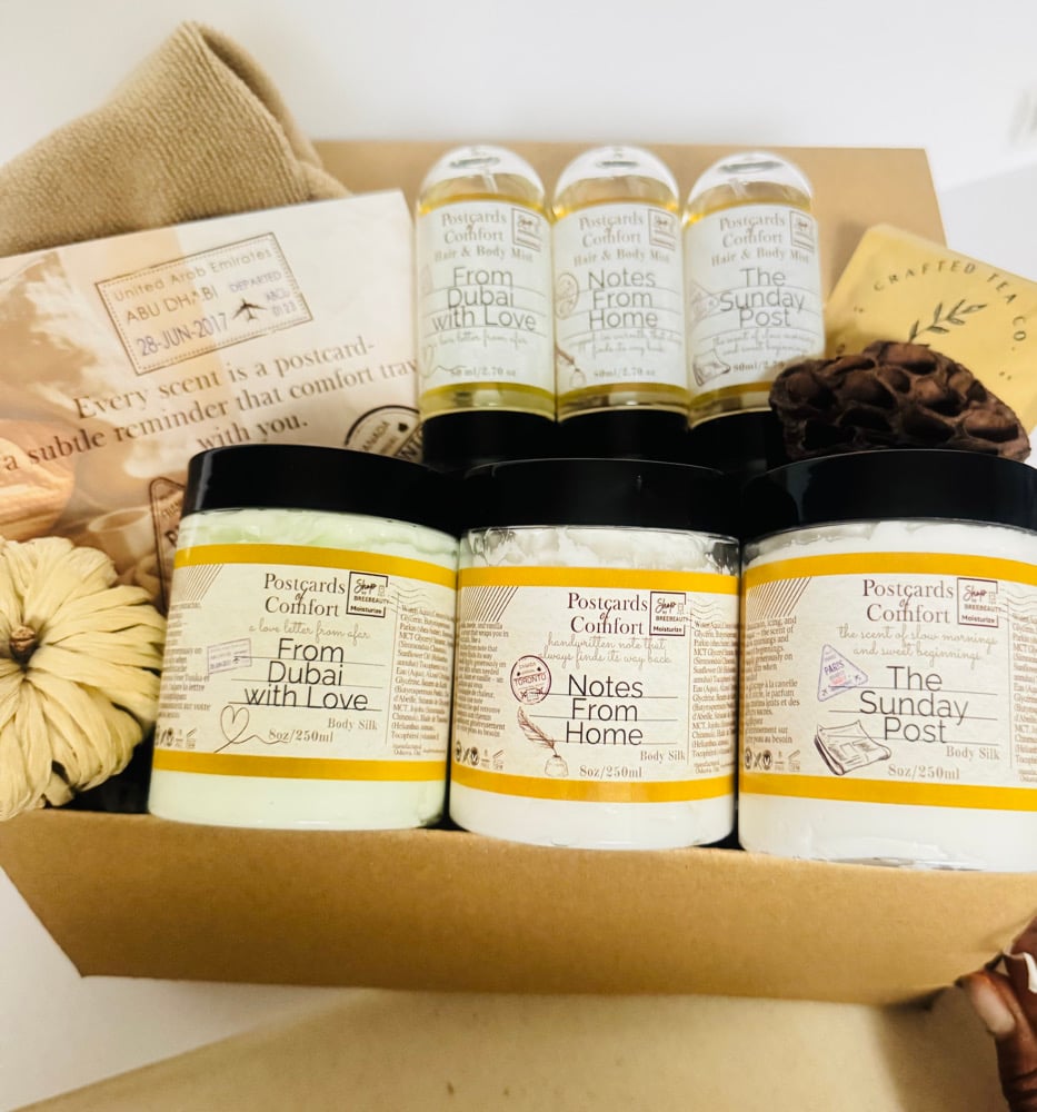 Comes with three 8 oz Body butters and three 80 ml hair and body mist